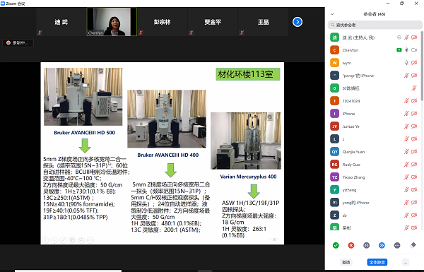 吴节莉老师则重点介绍了学校分析测试中心核磁实验室的仪器特点,在液体核磁、固体核磁和低场核磁方面应用案例和服务特色。校分测核磁实验室配有四台高场,一台低场核磁共振谱仪,五台仪器特点不同,性能互补,在不同的应用领域各自发挥重要作用。通过杂核检测、分子动力学研究、小鼠成像等案例,吴老师生动展示了核磁共振技术在化学、材料及生物科学研究中的应用。最后还介绍了校分测的服务特色,校分测综合液相、固相和成像等多种手段,一对一提出个性化综合解决方案,为师生提供全方位一站式全流程服务。